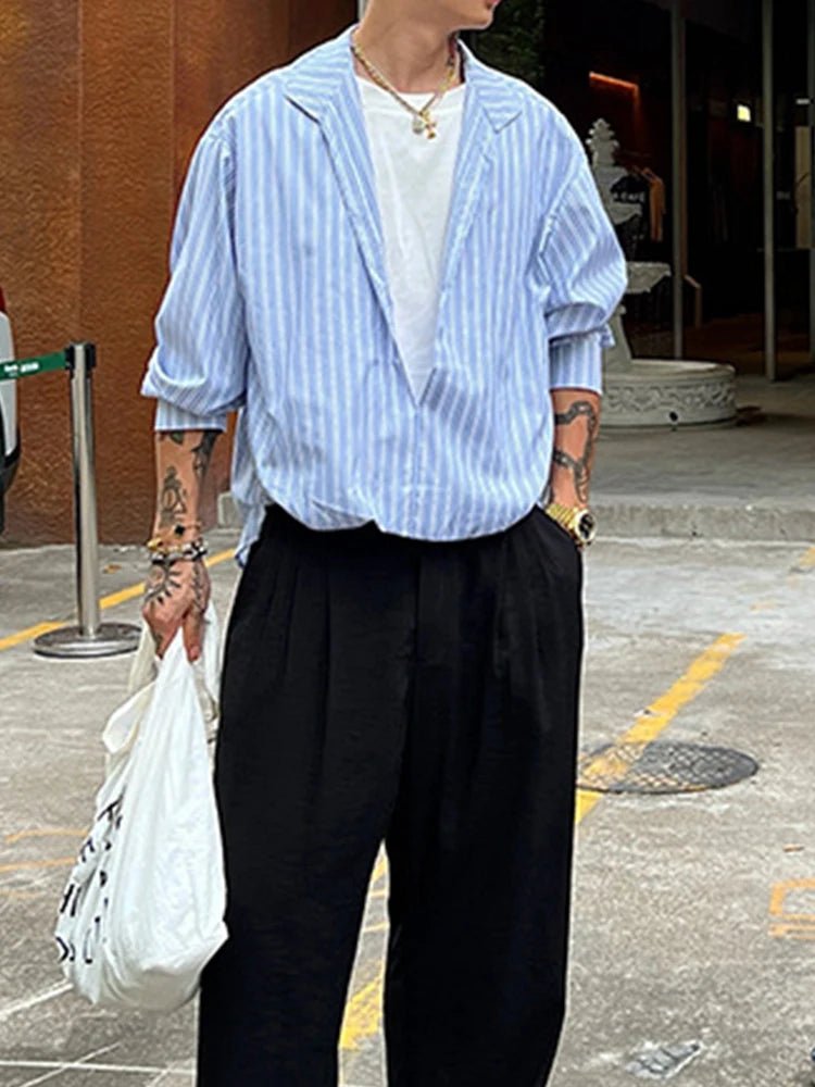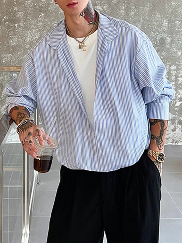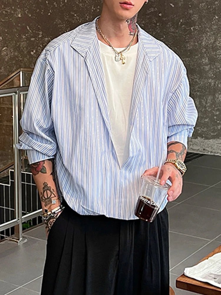 Long Sleeve Striped Shirt for Men with V-Neck and Patchwork Design